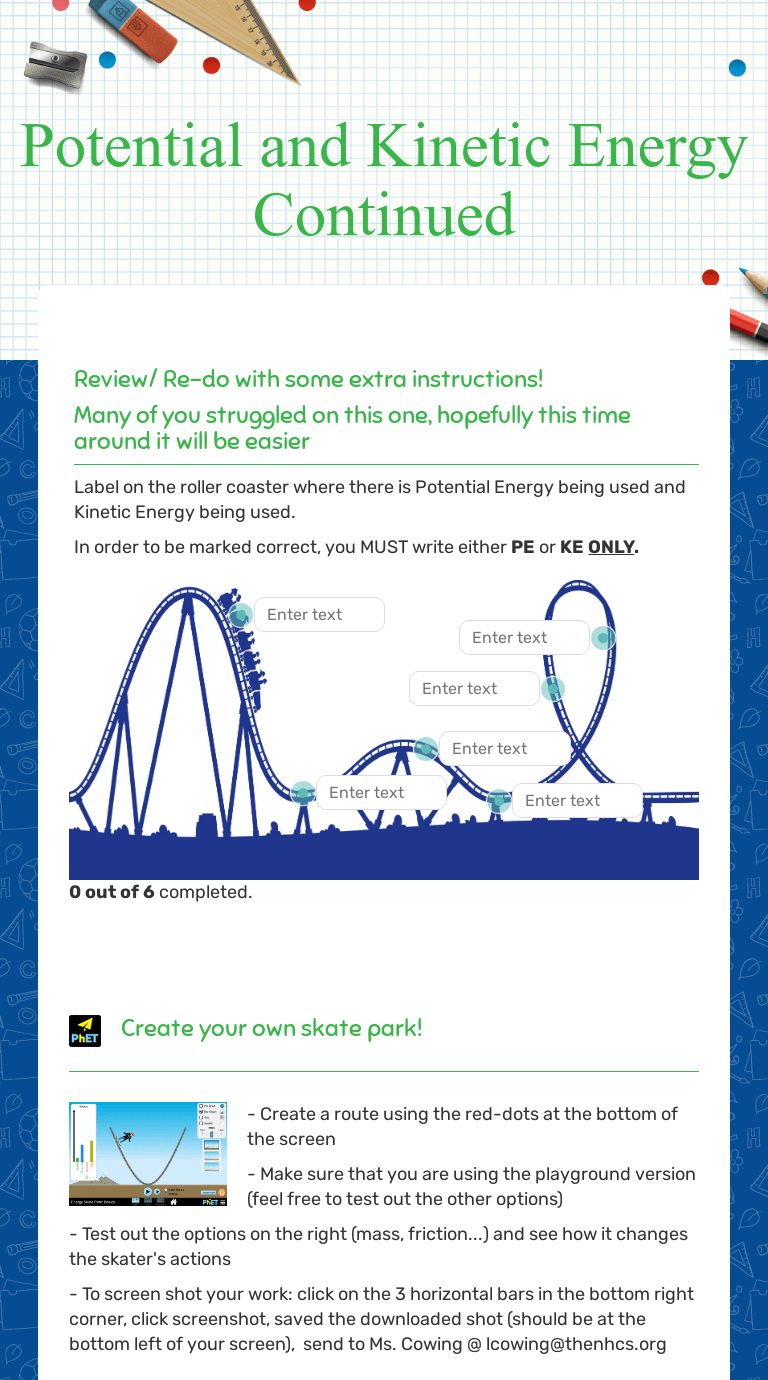 Roller Coaster Energy Worksheet : Kinetic And Potential Energy Worksheet And Potential Energy Worksheet Determine Whether The Objects In The Following Problems Have Kinetic Or Potential Energy Remember Kinetic Energy Pdf Document /. The bell weighs 19 kg. Then, the increased potential energy of the cars is converted into enough kinetic energy to keep them in motion for the length of the track. Learn about the conservation of energy in the context of a roller coaster using our interactive simulation. A cinder block is sitting on a platform 20 m high. 22.11.2021 · roller coaster mechanical model self craft deco education gift.